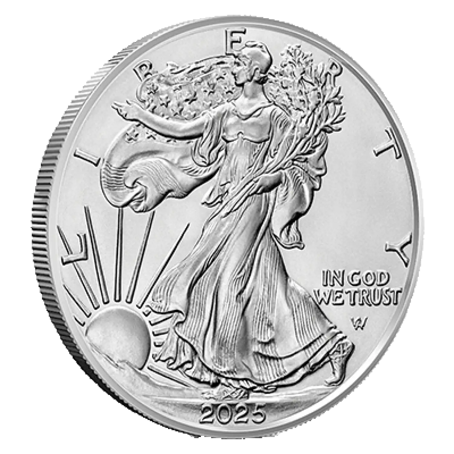 The obverse of the 2025 American Silver Eagle Coin features the legendary Walking Liberty design, created by Adolph A. Weinman. This timeless design depicts Lady Liberty walking gracefully towards the sun, exuding freedom and confidence. Her folds of the American flag draped over her shoulders, while her right hand extends outward, grasping a bundle of olive branches. The obverse also bears the inscriptions "LIBERTY" and "IN GOD WE TRUST."
