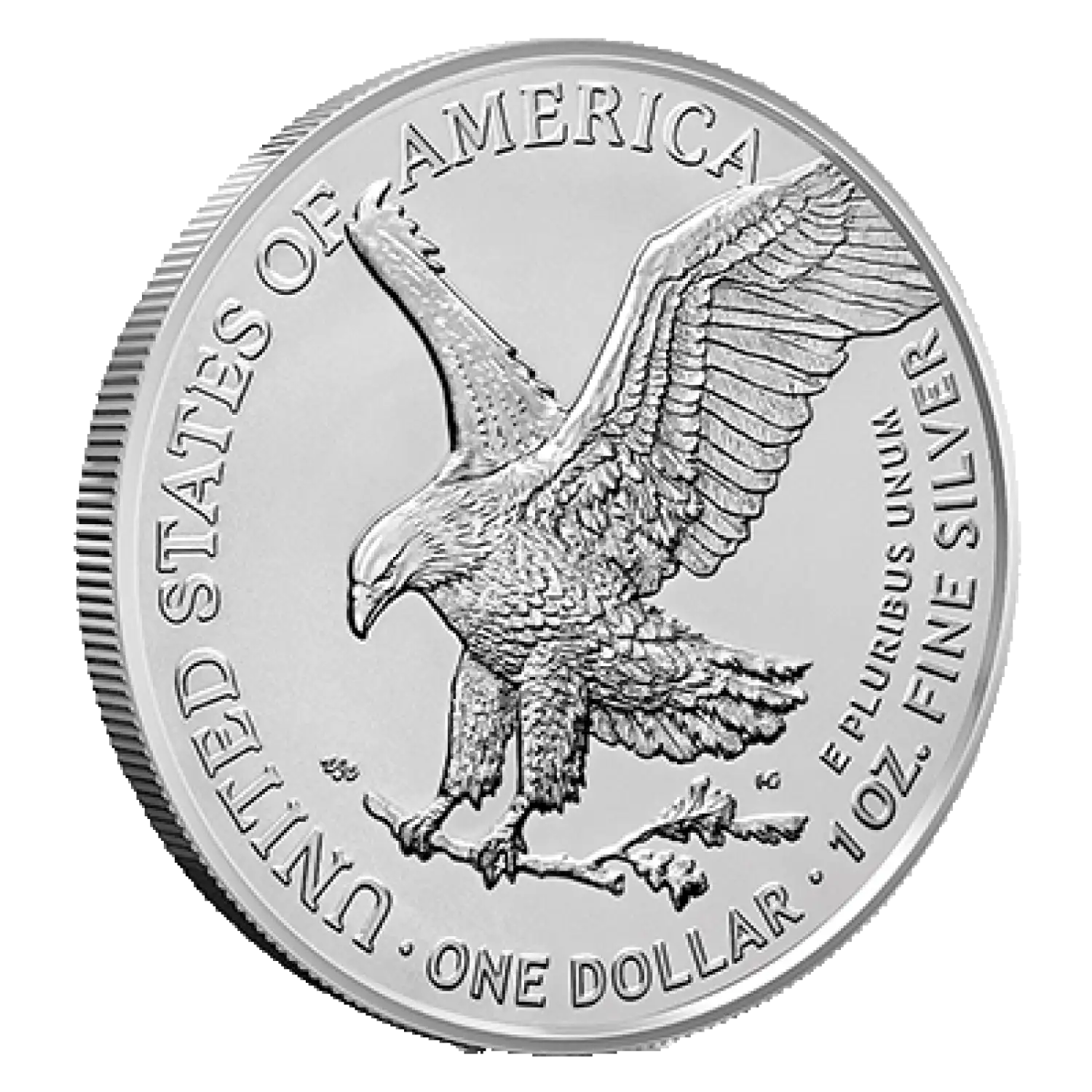 The reverse of the coin showcases the majestic American bald eagle, crafted by John Mercanti. Perched proudly on a branch, the eagle gazes outwards, symbolizing strength, courage, and independence. The reverse also features the inscriptions "UNITED STATES OF AMERICA," "1 OZ. FINE SILVER," and "ONE DOLLAR."